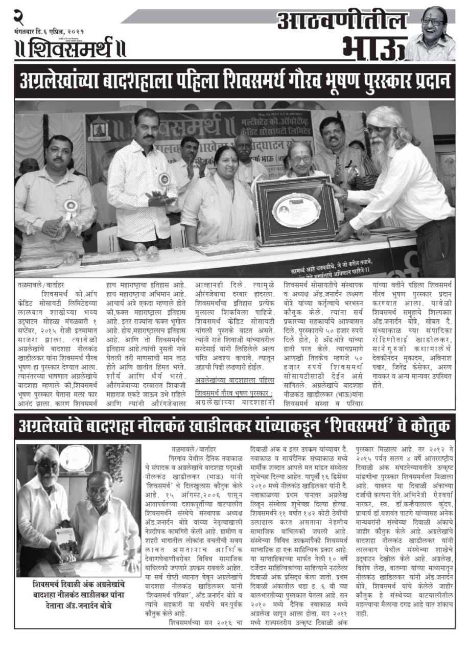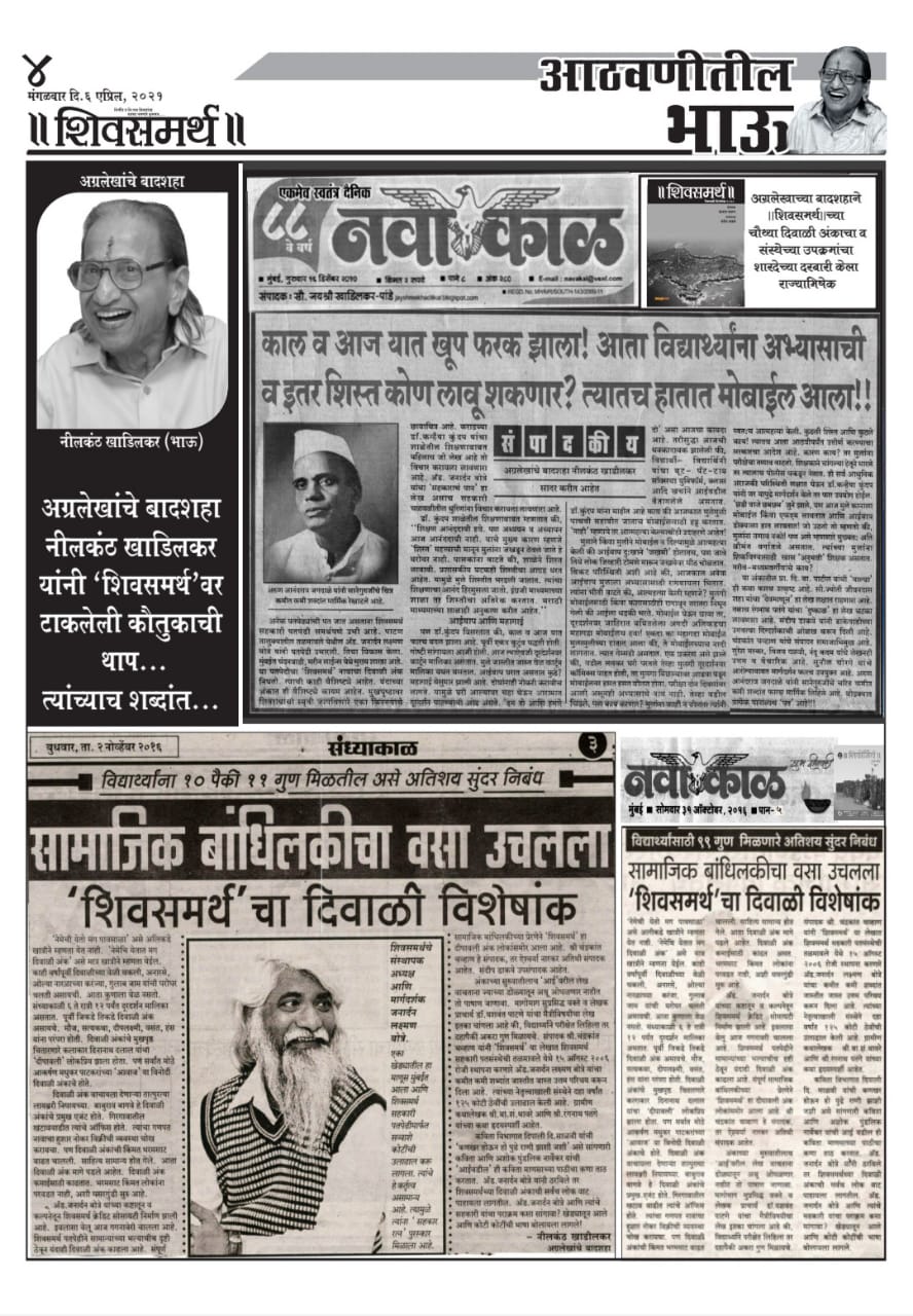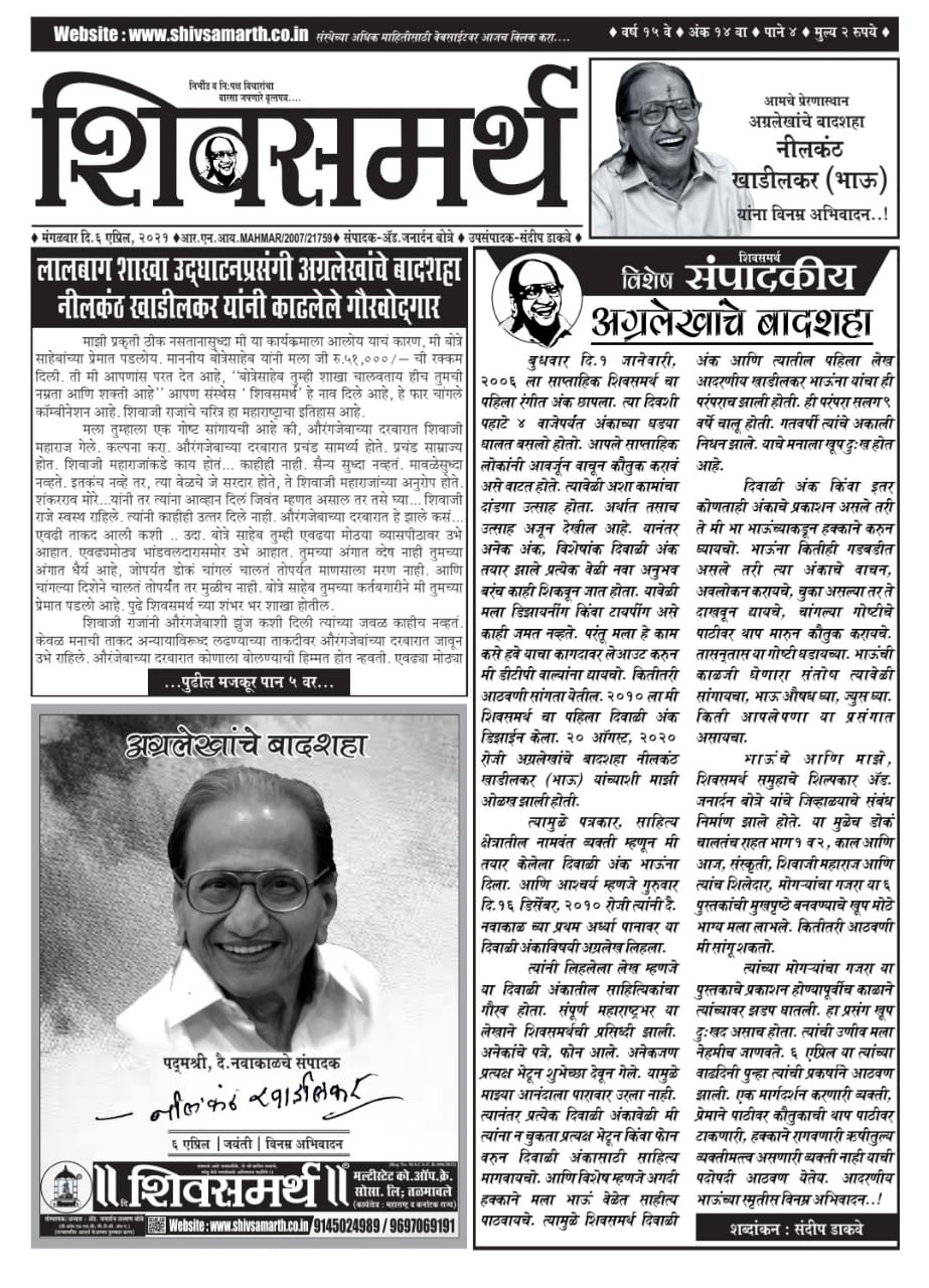 आमचे दैवत अग्रलेखांचे बादशहा नीलकंठ खाडीलकर (भाऊ) यांच्याविषयींच्या आठवणी जागवणारा सा.शिवसमर्थ चा अंक...