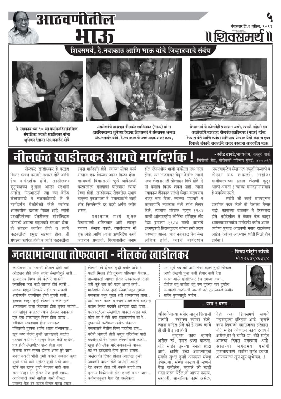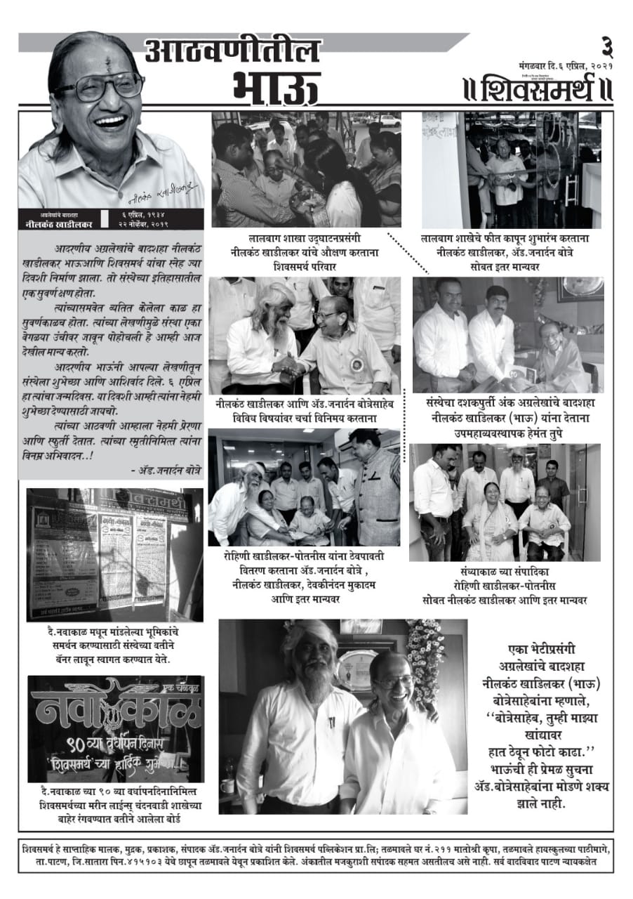 आमचे दैवत अग्रलेखांचे बादशहा नीलकंठ खाडीलकर (भाऊ) यांच्याविषयींच्या आठवणी जागवणारा सा.शिवसमर्थ चा अंक...